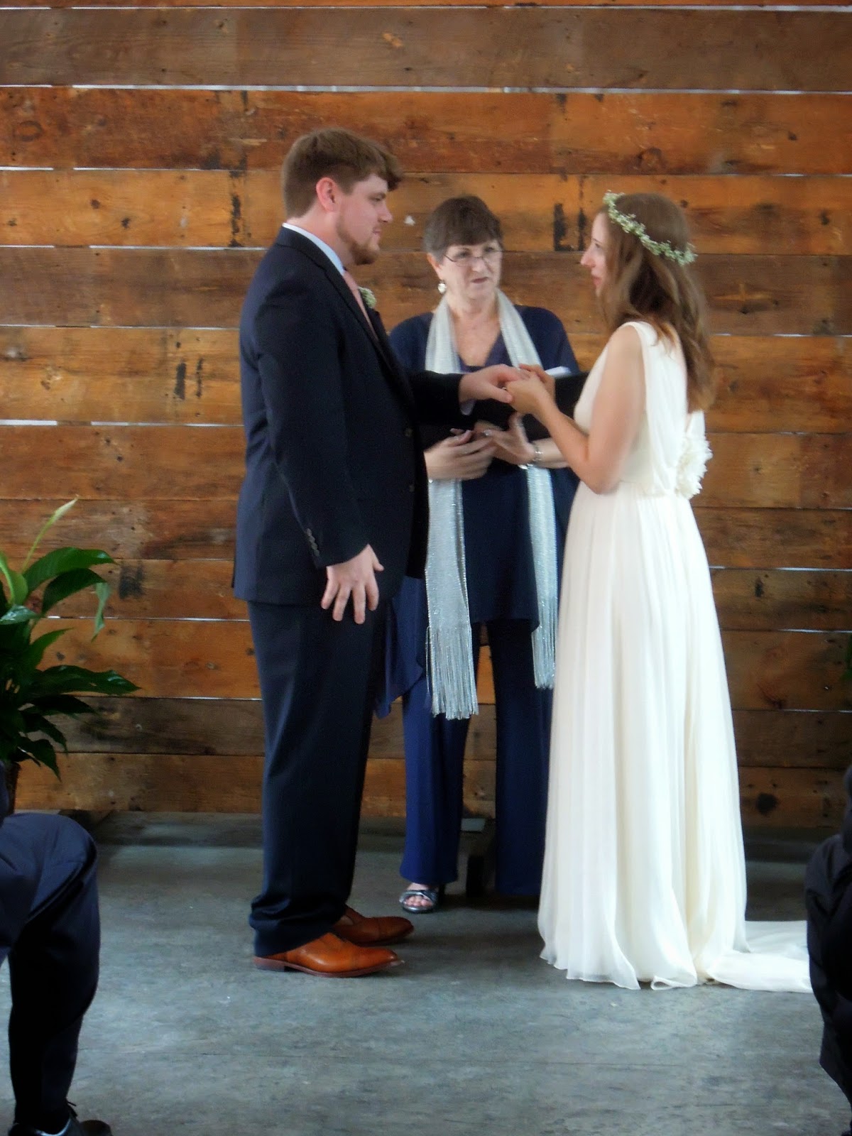 And here we go! Kristin and Andrew did not like the white curtains for their "backdrop" so Andrew built that wall of recycled wooden boards for the occasion which will be used in their home. It was so heavy it had to be transported in two pieces. The florals were DIY and the simplicity of the baby's breath and green peace lilies was elegant and very organic!Welcome to all! (You may notice that the bride and groom are on opposite sides than traditional. The parents wanted to see their child's face during the ceremony instead of their backs. I get this request from time to time and it makes sense to me!)
